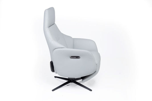 Poltronas reclináveis e giratórias, revestidas em couro, com mecanismo de giro inteligente....