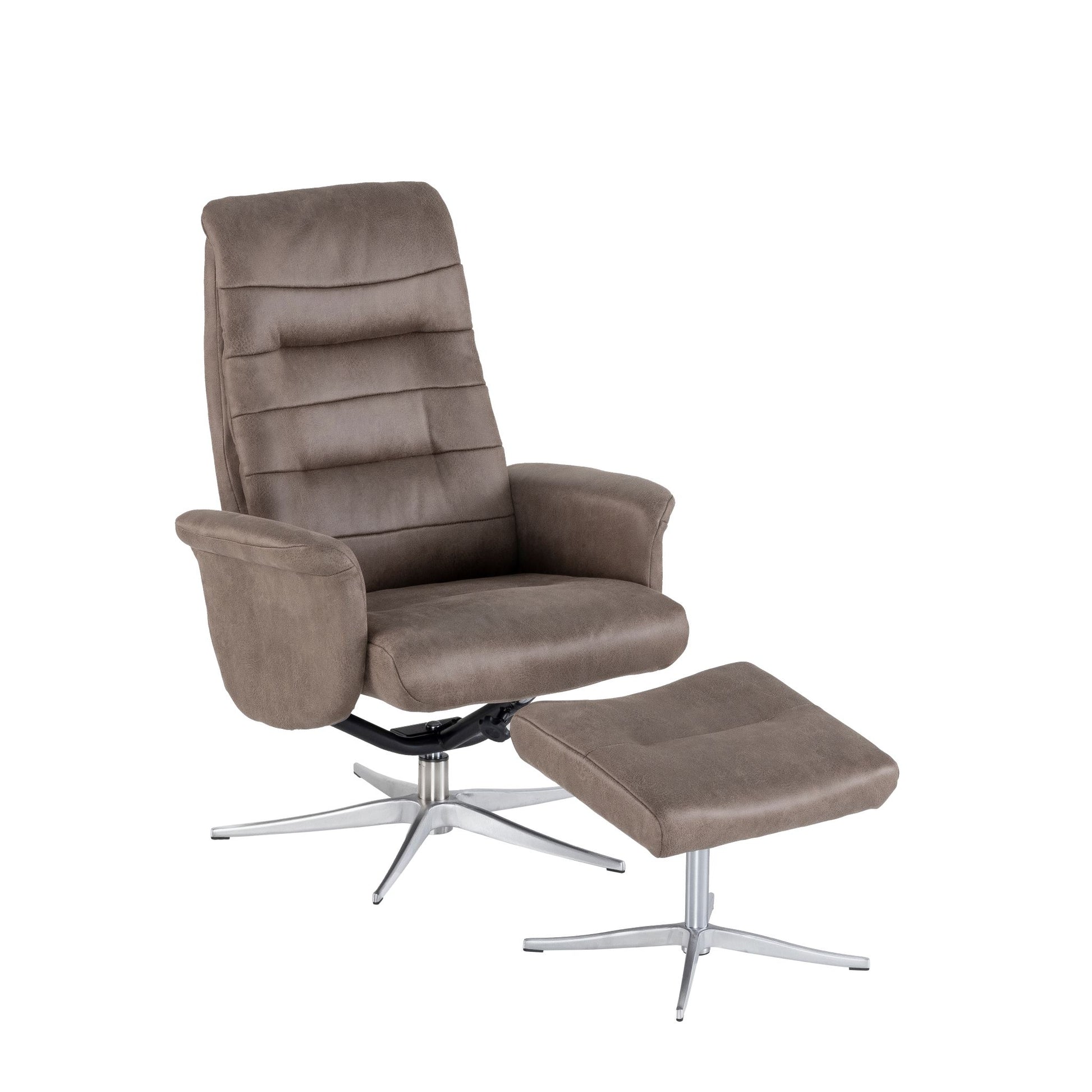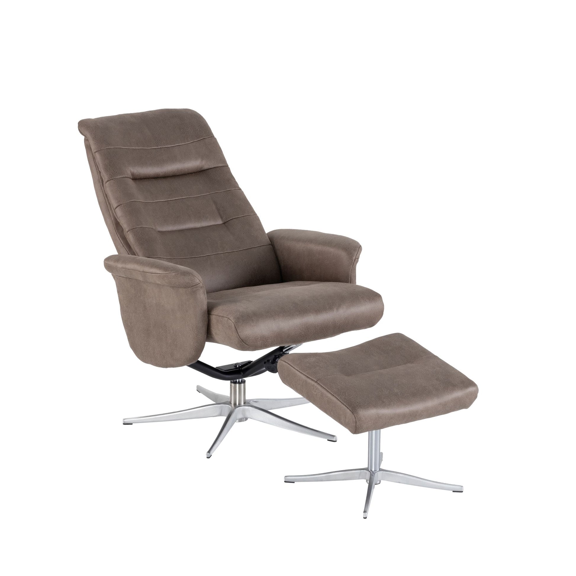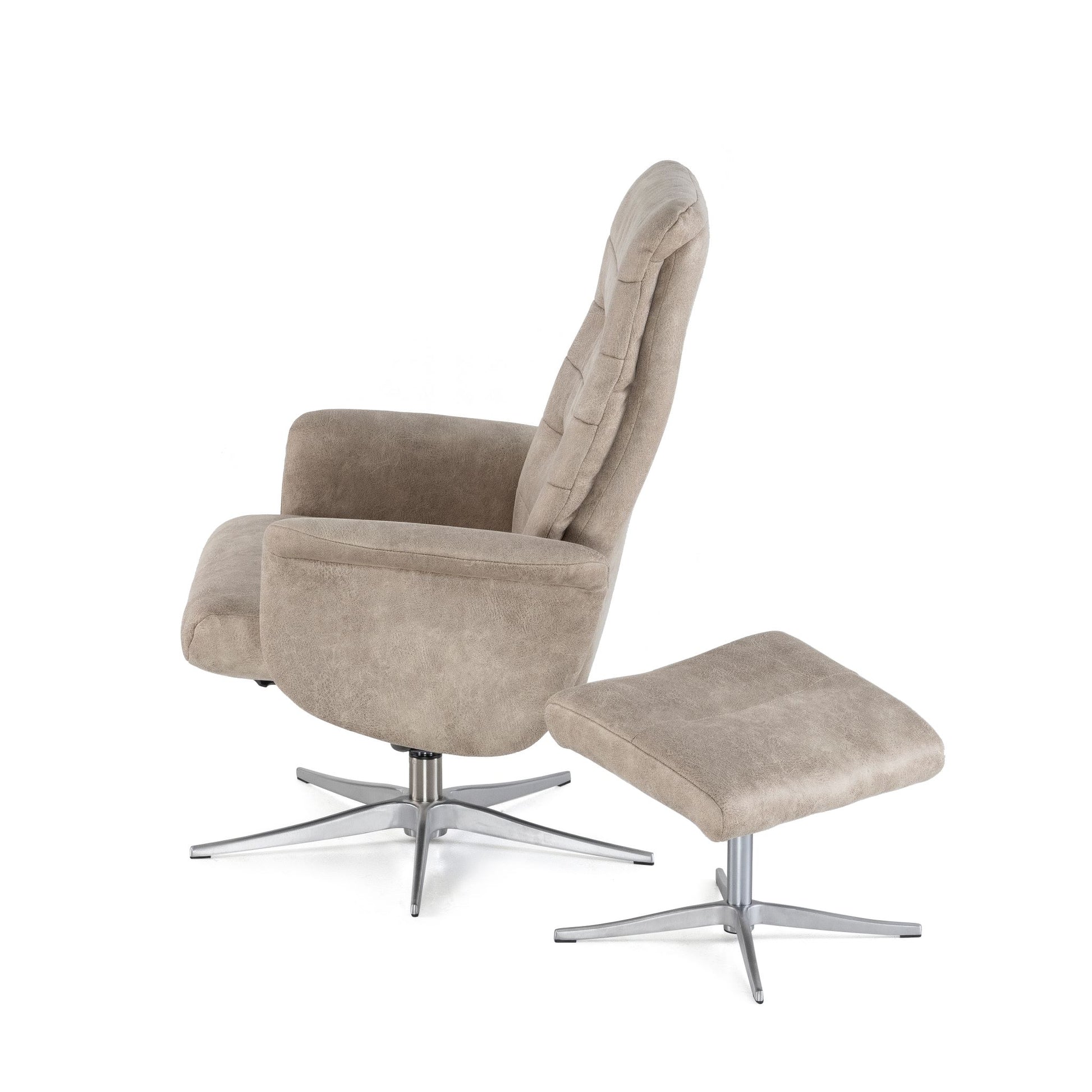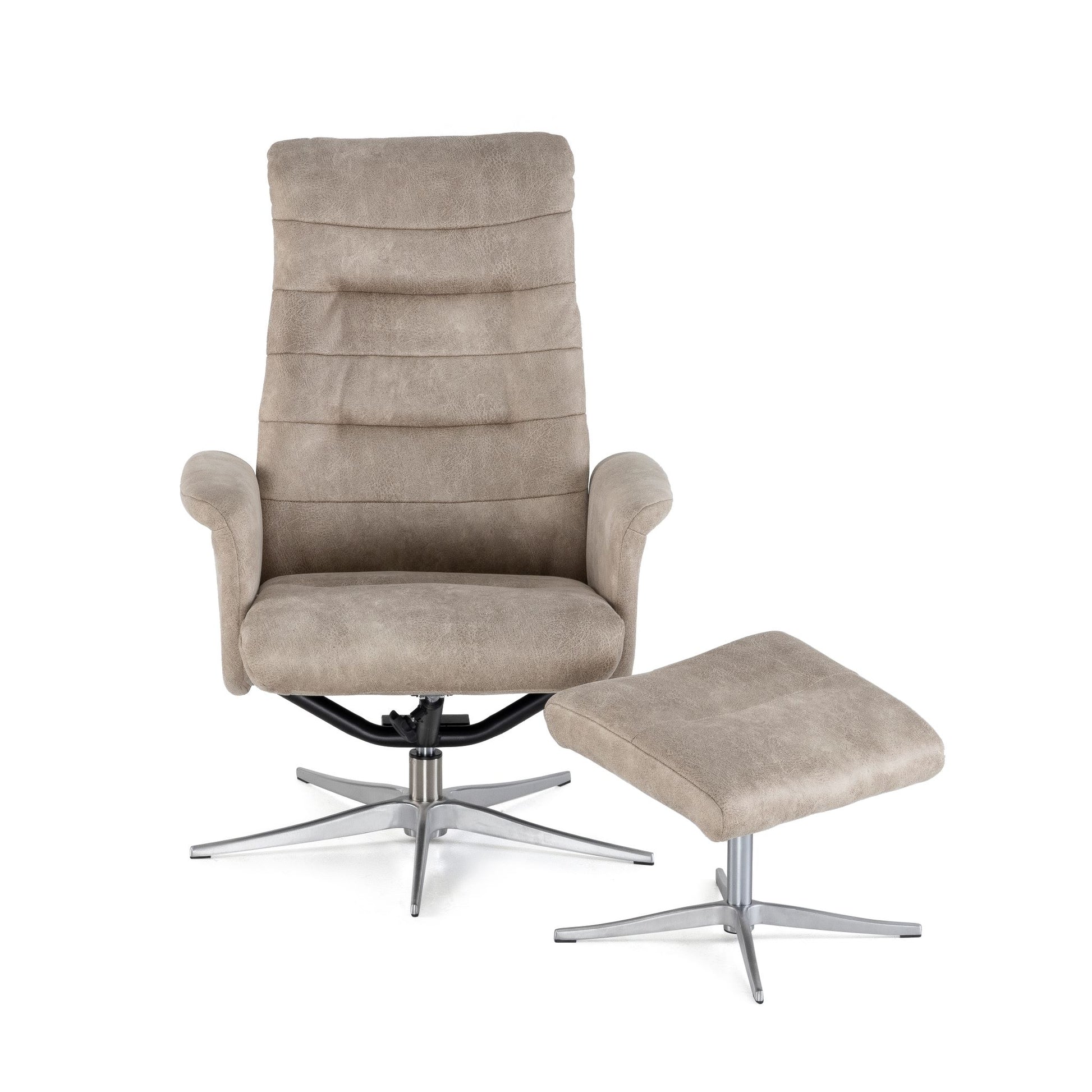 Poltrona giratória e reclinável com acionamento mecânico. Basta recostar e a poltrona reclinada. Acompanha banqueta. Revestimento em tecido ultramacio. Base em metal.
