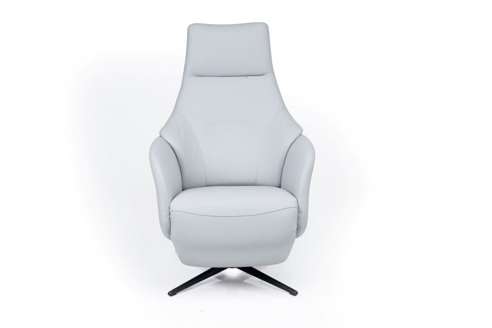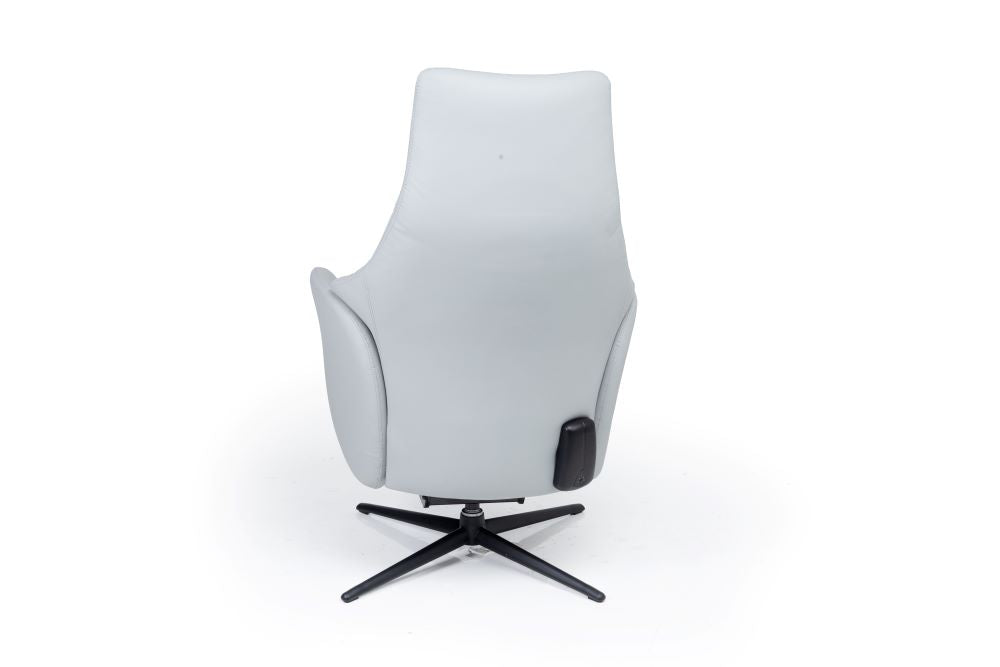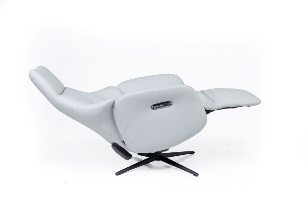 Poltrona automática reclinável e giratória com chaise extensível. Bivolt. Conta com acionamento individualizado do reclino e do encosto, o que permite o usuário ficar sentado com os pés esticados. Base em metal com pintura eletrostática. Revestimento em couro natural no encosto, assento, braços e peseira. Equipada com bateria de autonomia aproximada de 48 horas e com entrada USB e USB/C.
